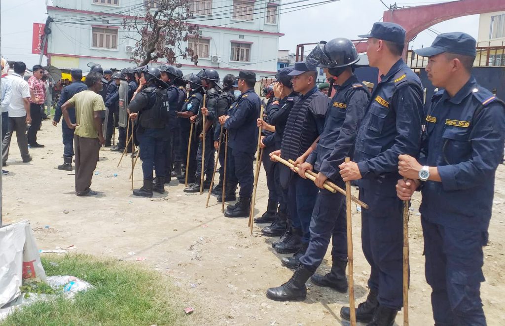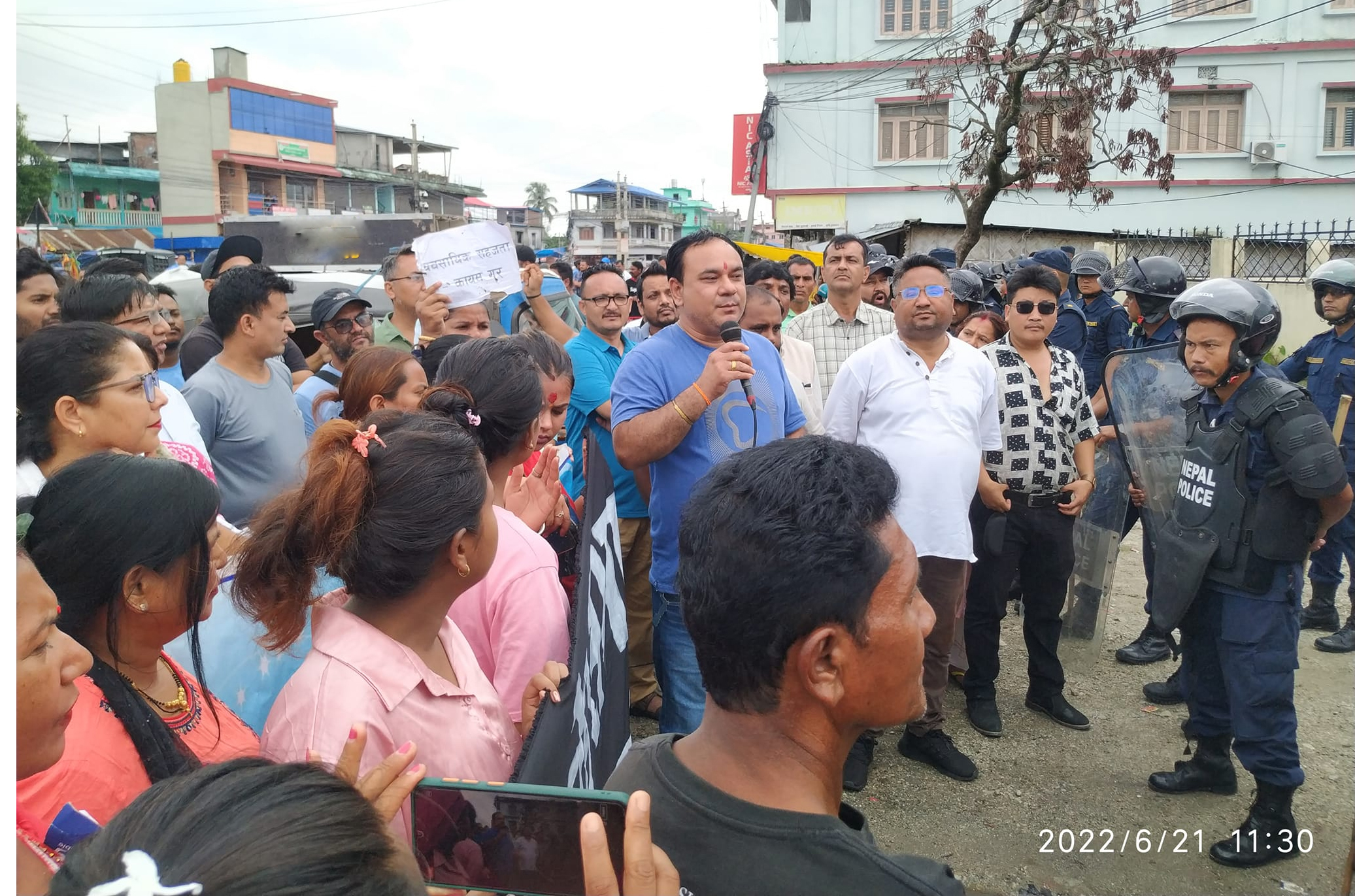 विद्युत मिटर माग गर्दै ब्यवसायीहरु चारदिनदेखि निरन्तर धर्नामा थिए । बुधबार पनि ब्यवसायीको धर्ना निरन्तर थियो । नगरपालिका अगाडि विहानैदेखि लगभग डेढसयको संख्यामा प्रहरी परिचालन गरिएको थियो । लगभग ८० बढीको संख्यामा रहेका ब्यवसायीहरु विहान ११ बजे ‘वित्तीय शुसासन कायम गर’ ‘ब्यवसायीलाई मिटर जडानका लागि सिफारिस दे’ लगायतका नारासहित नगरपालिका परिसर अगाडि पुगे ।