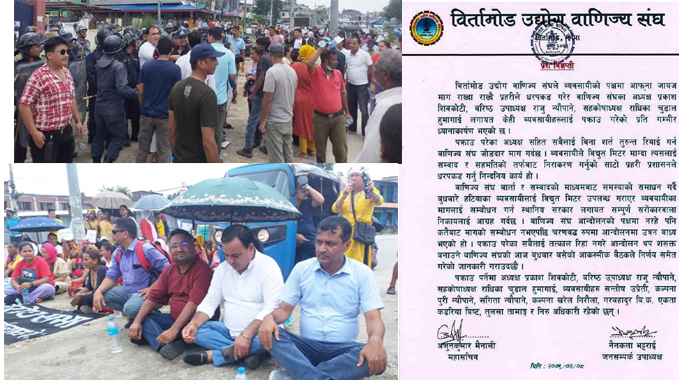 विद्युत जडानका लागि मिटरको सिफारिस गर्दै गत आइतबारदेखि निरन्तर प्रदर्शन गर्दै आएका थिए । साृेही निरन्तरता स्वरुप बुधबार धर्नामा बसेका थिए । शान्तिपूर्ण धर्नामा बसेका व्यवसायीका नेतालाई प्रहरीले जबरजस्ती पक्राउ गरेर इलाका प्रहरी कार्यालय अनारमनी पुर्याएको थियो ।