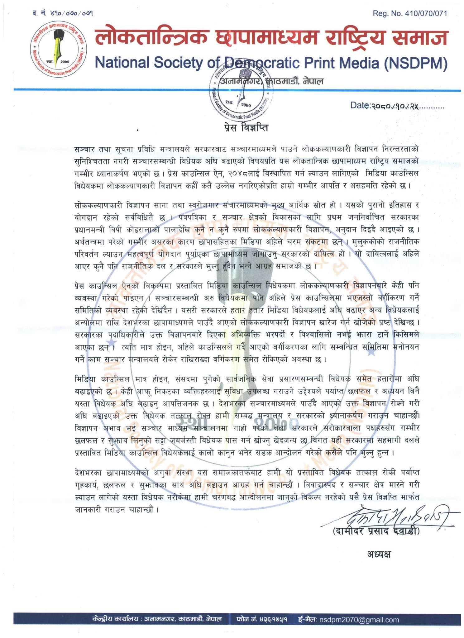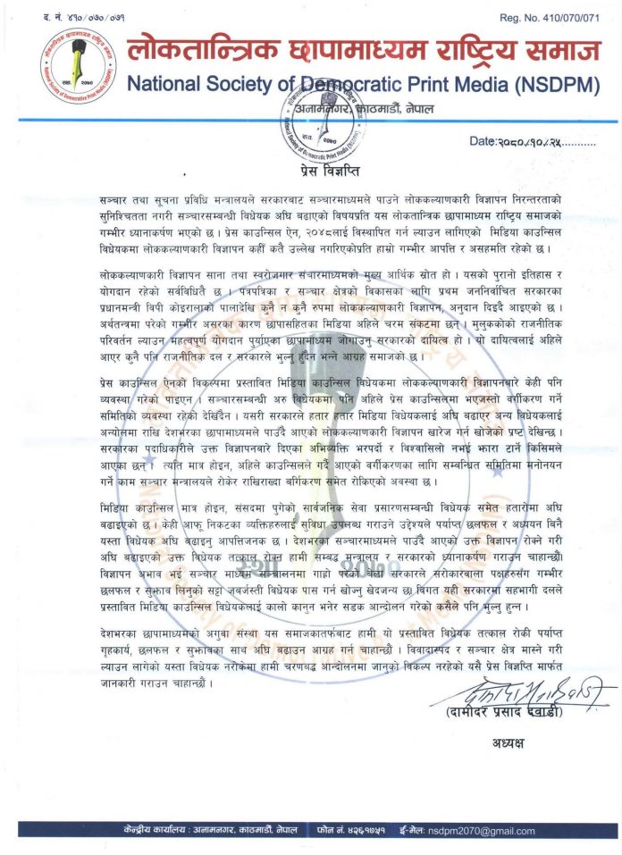 प्रेस काउन्सिल ऐन, २०४८लाई विस्थापित गर्ने गरी ल्याउन लागिएको मिडिया काउन्सिल विधेयकमा लोककल्याणकारी विज्ञापन कहीँ कतै उल्लेख नगरिएकोप्रति गम्भीर आपत्ति र असहमति रहेको समाजका अध्यक्ष दामादोरप्रसाद दवाडीद्वारा हस्ताक्षरित विज्ञप्तिमा उल्लेख छ ।
