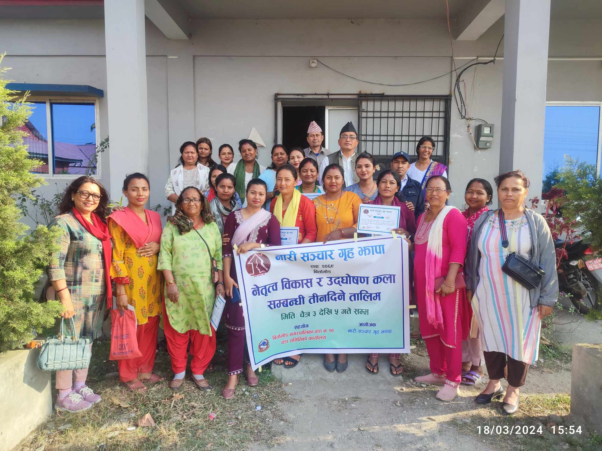 नारी सञ्चार गृह झापाकी अध्यक्ष रेजिना गौतमको अध्यक्षता तथा वडाध्यक्ष गुरुङको प्रमुख आतिथ्यमा सम्पन्न कार्यक्रममा वडासदस्यहरु पृथ्वीबहादुर बस्नेत, धनमाया श्रेष्ठ, दिपिका शिवा, १० नं. वडा महिला सञ्जालकी अध्यक्ष खिलेश्वरी पाण्डे लगायतले शुभकामना राखेका थिए । तीन दिनसम्म सञ्चालित तालिमको सहजीकरण नारी सञ्चार गृहकी निवर्तमान अध्यक्ष भिमा शिवाकोटीले गरेकी थिइन् । समापन कार्यक्रमकाे सञ्चालन सहभागी सुमित्रा गहतराज र स्वागत गंगा नेपालीले गरेकी थिइन ।