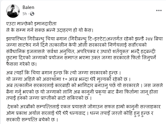 मेयर शाहले भनेका छन्–‘झापास्थित गिरीबन्धु चिया बगान (गिरीबन्धु टि–इस्टेट) अन्तर्गत रहेको झन्डै ३४४ बिघा जग्गा साटफेर गर्न दिने तत्कालीन केपी ओली सरकारको निर्णयलाई सर्वोच्चका संवैधानिक इजलासले ‘सर्वथा अनुचित, अपरिपक्व र उधारो शर्तयुक्त’ भन्दै हदबन्दी छुटमा दिएको जग्गाको प्रयोजन समाप्त भएमा उक्त जग्गा सरकारले फिर्ता लिनुपर्ने फैसला गरेको छ ।’