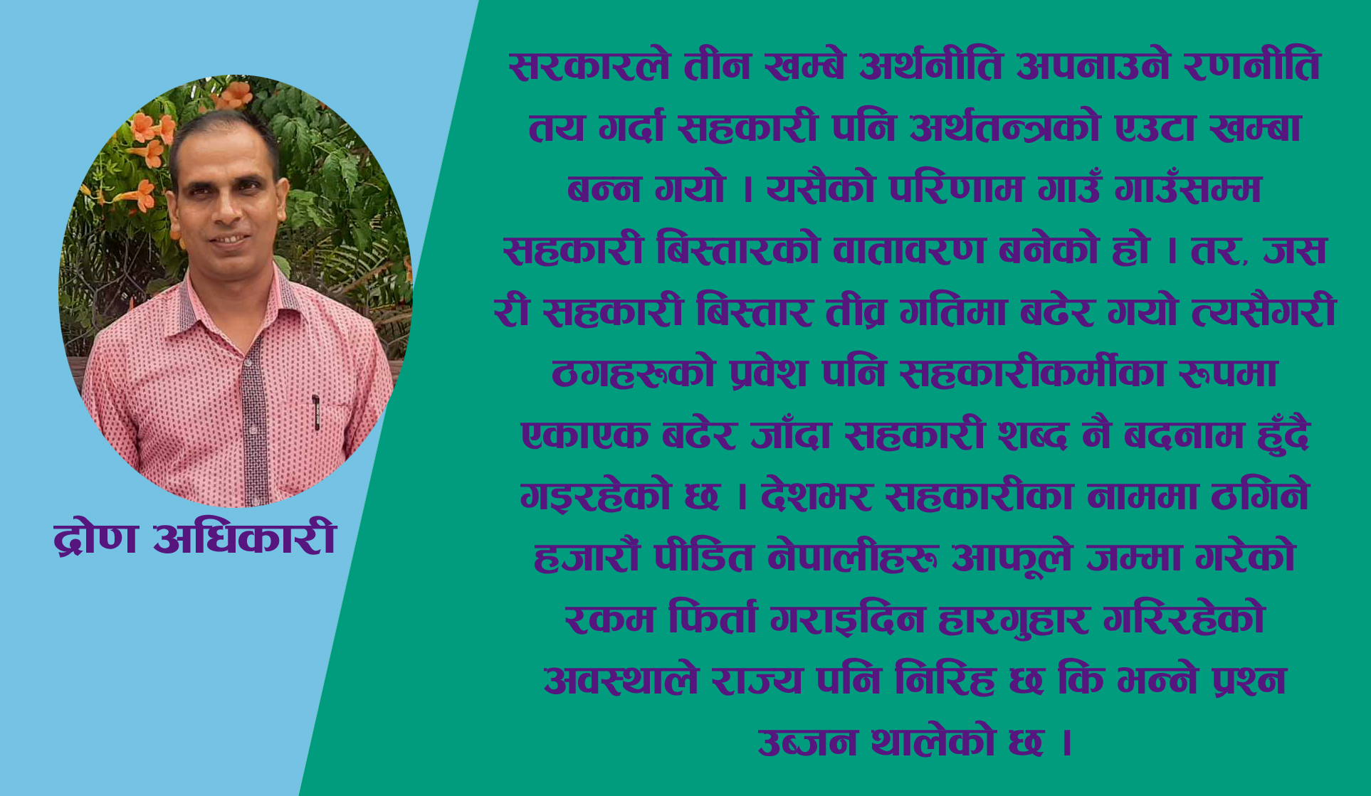सहकारी शब्दको अर्थ सहकार्य भन्ने हुन्छ । वि सं २०४६ सालको राजनीतिक परिवर्तनसित नेपालको अर्थतन्त्रमा उदारीकरणको प्रवेश भयो । सरकारले तीन खम्बे अर्थनीति अपनाउने रणनीति तय गर्दा सहकारी पनि अर्थतन्त्रको एउटा खम्बा बन्न गयो । यसैको परिणाम गाउँ गाउँसम्म सहकारी बिस्तारको वातावरण बनेको हो । तर, जसरी सहकारी बिस्तार तीव्र गतिमा बढेर गयो त्यसैगरी ठगहरूको प्रवेश पनि सहकारीकर्मीका रूपमा एकाएक बढेर जाँदा सहकारी शब्द नै बदनाम हुँदै गइरहेको छ । देशभर सहकारीका नाममा ठगिने हजारौं पीडित नेपालीहरू आफूले जम्मा गरेको रकम फिर्ता गराइदिन हारगुहार गरिरहेको अवस्थाले राज्य पनि निरिह छ कि भन्ने प्रश्न उब्जन थालेको छ । पछिल्लो पटक झापामा मात्र बचतकर्ताहरूको निक्षेप रकम फिर्ता नगर्ने पाँचवटा सहकारी संस्थामाथि औपचारिक रूपमै उजुरी परेको छ । बचतकर्ताहरुको करोडौं रकम हिनामिना गर्ने पहिलो पाइला बहुउद्देश्यीय सहकारी संस्था भद्रपुर, समाजसेवी बहुउद्देश्यीय सहकारी संस्था बिर्तामोड, जयपुर बहुउद्देश्यीय सहकारी संस्था बुद्धशान्ति, पूर्वार्ध कृषि सहकारी संस्था अर्जुनधारा र संयुक्त कलाकर्मी बचत तथा ऋण सहकारी संस्था दमकमाथि पीडित बचतकर्ताबाट उजुरी परेको हो । यी सहकारी बाहेक झापाको सदरमुकाम भद्रपुरमै रहेर करोड बढी बचत रकम फिर्ता गर्न नसक्ने शुभसाइत सहकारी तथा उत्तरदायित्व सहकारीका बचतकर्ता पनि उजुरीका लागि संगठित हुँदै गएको अवस्था छ । खाइनखाई भविष्यका लागि भनेर सहकारीमा बचत गरेको करोडौं रुपैयाँ बचत फिर्ता गर्न आनकान गर्ने सहकारीका सञ्चालक बिरूद्ध कडा कारवाही गरी बचतकर्ताको बचत रकम फिर्ताको बातावरण सरकारले बनाइ दिनु पर्छ । सरकार नागरिकको अभिभावक हो भन्ने भान दिलाउन पनि नीति र नियमको सही प्रयोग गर्दै बचतकर्ताको बचत रकम हिनामिना गर्ने सहकारीका सञ्चालकबाट असुली गर्दै पीडाबाट मुक्त गराउनु पर्छ ।