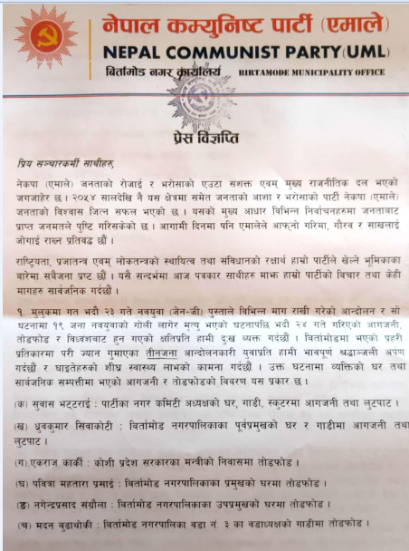 जेनजी आन्दोलनका नाममा भदौं २४ गते अराजक समूहबाट गरिएको नगर अध्यक्ष भट्टराईसहित नेकपा एमालेका कार्यकर्ता तथा पदको जिम्मेवारीमा रहेका नेकपा एमालेमा सम्वद्धको नीजि घर/गाडीमा भएको आगजनी,तोडफोडको विवरण समेत सार्वजनिक गरेको छ । पार्टीद्वारा सार्वजनिक विवरण अनुसार भदौ २४ गते अध्यक्ष भट्टराई, पूर्व मेयर ध्रुवकुमार शिवाकोटी, कोशी प्रदेश सरकारका मन्त्री एकराज कार्की, बिर्तामोड नगरपालिका मेयर र उपमेयरका घर तोडफोड, वडा नं.–३ का वडाध्यक्षको गाडी