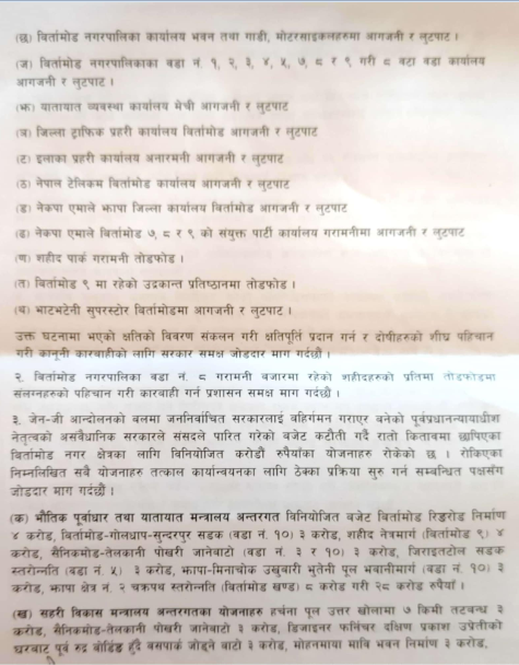 त्यसैगरी सार्वजनिक सम्पत्तीतर्फ भएको भौतिक संरचनाको क्षतिबारे उल्लेख गरेको नगरकमिटीले अन्तरिम सरकारले भौतिक संरचनातर्फको करोडौं रकम कटौती गर्दा योजनाहरु अलपत्र परेको जनाएको छ ।