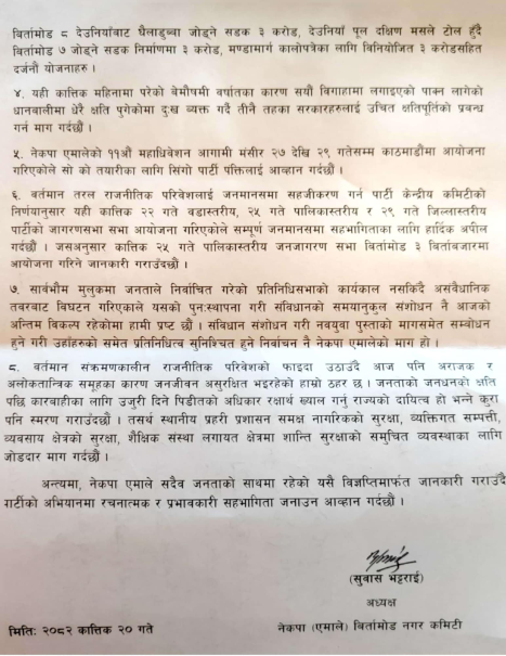 नगर कमिटीले आज पत्रकार सम्मेलनको आयोजना गर्दै जेनजीले उठाएका भ्रष्टाचार नियन्त्रण हुनुपर्ने, सुशासन कायम हुनुपर्ने माग नेकपा एमालेको पनि भएको उल्लेख गर्दै विना कारण तोडफोड, लुटपाट र आगो लगाउने जस्ता आपधारिक कार्यमा संलग्नलाई सरकारले कारवाही गर्नु धारणा सार्वजनिक गरेको हो ।