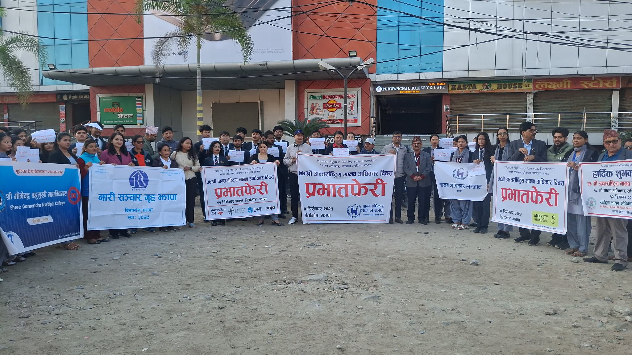यसअघि हनुमान सेन्ट्रल अगाडिबाट निस्किएको प्रभातफेरीले मुक्तिचोक पूर्व–पश्चिम परिक्रममा गरेको थियो । मानव अधिकारसंग सम्बन्धित विभिन्न नारासहित प्लेकार्ड बोकेर निस्किएको प्रभातफेरी पछि सुरेस अग्रवाल भद्रपुरे, तोया काफ्ले, रेजिना गौतम, कञ्चना ढकाल लगायतले सम्बोधन गर्दै कुनै पनि व्यक्तिले मानवअधिकारका न्यूनतम अधिकारको उपभोग गर्न पाउनुपर्नेमा जोड दिए । कार्यक्रमको दिपक दासले सञ्चालन गरेका थिए ।