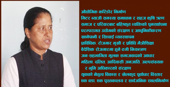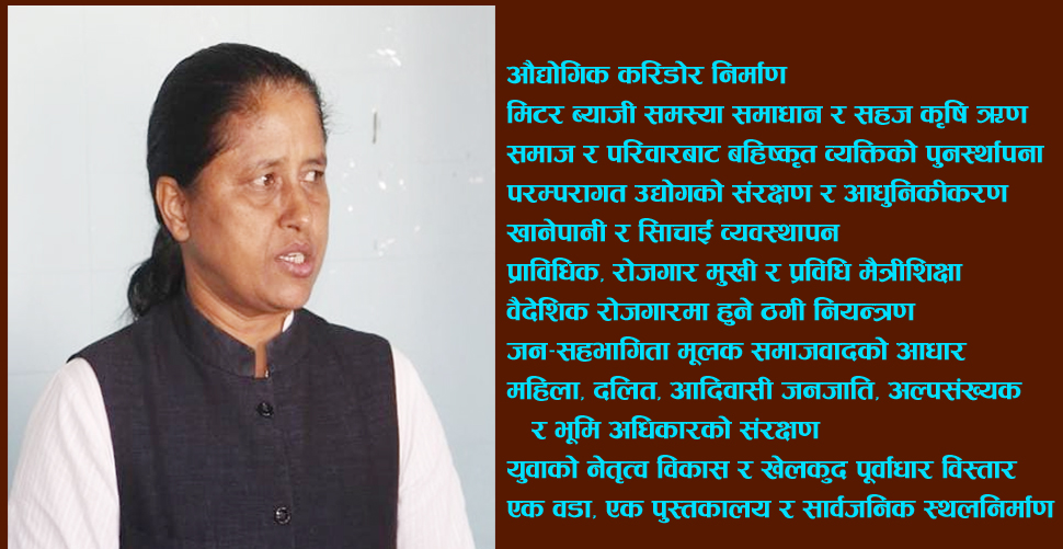 शिक्षा, व्यापार र स्वास्थ्य बिर्तामोडलाई क्षेत्रीय हबको रूपमा विकास, धार्मिक तथा पर्यटकीय विकास, चारपाने दक्षिण बेल्टमा औद्योगिक करिडोर, मिटर ब्याजी समस्या समाधान र सहज कृषि ऋण, समाज र परिवारबाट बहिष्कृत व्यक्तिको पुनस्र्थापना, परम्परागत उद्योगको संरक्षण र आधुनिकीकरण, खानेपानी र सिँचाई व्यवस्थापन, प्राविधिक, रोजगार मुखी र प्रविधि मैत्रीशिक्षा, वैदेशिक रोजगारमा हुने ठगी नियन्त्रण, जन–सहभागिता मूलक समाजवादको आधार, महिला, दलित, आदिवासी जनजाति, अल्पसंख्यक र भूमि अधिकारको संरक्षण, युवाको नेतृत्व विकास र खेलकुद पूर्वाधार विस्तार, एक वडा, एक पुस्तकालय र सार्वजनिक स्थलनिर्माण, वातावरण संरक्षण र जलवायु अनुकूल विकास, शान्ति, सुशासन र भ्रष्टाचार विरुद्ध शून्य सहनशीलता, सूचना प्रबिधिको विकास र संचार माध्यम, सूचना प्रबिधिको विकास र संचार माध्यम, कला, भाषा, साहित्यको विकास, सभ्य शहर, समुन्नत ग्रामीण बस्ती, कृषि, पशुपालन र दुग्ध उत्पादनको जोड दिने योजना लिएर चुनावी मैदानमा होमिएकी छन् ।