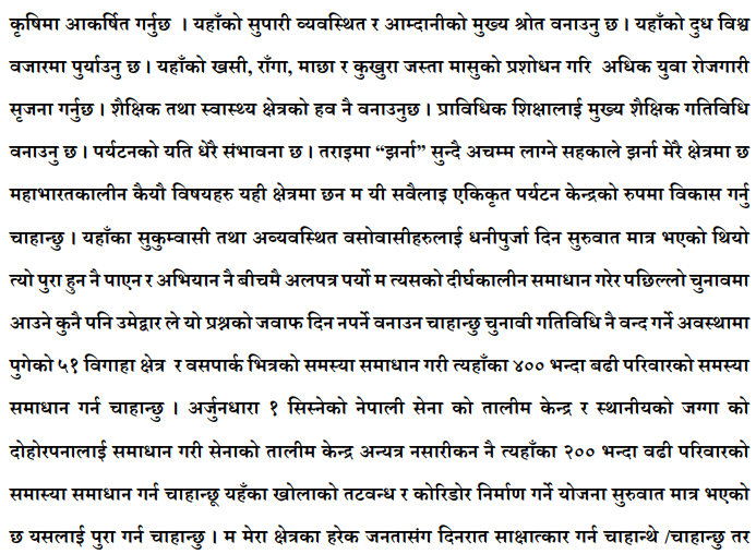 झापा क्षेत्र नं. २ मा आफू निर्वाचित हुनेमा विश्वस्त घिमिरेले निर्वाचित हुनुपर्ने आधारहरु समेत स्पष्ट पार्नुभएको छ । छोटो अवधीमा क्षेत्र नं. २ को विकासका लागि आफूले गरेको विकास निर्माणका काम, राजनीतिक, सैद्धान्तिक, ऐतिहासिक र प्रचार प्रसारमा जाँदा जनताले गरेको स्वागत र जनतामा देखिएको उत्साहले आफ्नो विजय सुनिस्चित रहेको दावी गर्नुभयो । आफ्नो प्रतिष्पर्धी यही हुन्छ भन्ने कुराका लागि परिणामबाटै थाहा भएको राम्रो हुने बताउँदै उहाँले घिमिरेले भन्नुभयो, ‘१८ जना उम्मेदवारबीचको प्रतिष्पर्धा हो, २ नं. क्षेत्रका जनताले मलाई जिताउनेमा ढुक्क छु, प्रतिष्पर्धी मैले छुट्याउनु राम्रो हुँदैन मत परिणामबाटै थाहा भएको राम्रो ।’