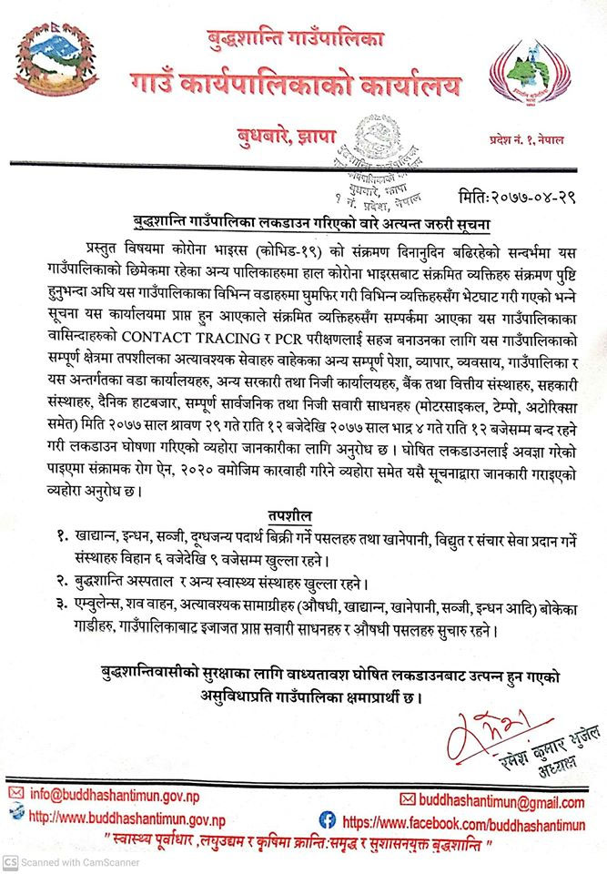 छिमेकी स्थानीय तहमा कोरोना संक्रमण पुष्टि भएका व्यक्तिहरु बुद्धशान्ति गाउँपालिकाका विभिन्न व्यक्तिहरुसंग भेटघाट गरेको सूचना प्राप्त भएसंगै उक्त अवधीभर अत्यावश्यक बाहेकका अन्य कुनै पनि व्यवसाय सञ्चालन तथा हिडडुल गर्न नपाइने गाउँपालिकाका अध्यक्ष रमेशकुमार भुजेलद्वारा जारी सूचनामा उल्लेख गरिएको छ ।