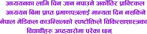 ‘स्वदेश तथा विदेशमा चिकित्साशास्त्र अध्ययन गरिरहेका तर, कोभिड–१९ महामारीका कारण साविक अध्ययनमा निरन्तरता हुन नसकेका चिकित्साशास्त्रको स्नातक तथा स्नातकोत्तर तहका विद्यार्थीको अध्ययन मान्यताका विषयमा नेपाल मेडिकल काउन्सिलमा विभिन्न माध्याममार्फत सोधपुछ तथा निवेदनहरु प्राप्त भएकोले यस विषयमा काउन्सिलले ‘शैद्धान्तिक कक्षाको पढाईबारे सम्बन्धीत कलेज/विश्वविद्यालयले व्यवस्था गरेबमोजिम हुने तर प्रयोगात्मक र अस्पतालमा गई बिरामीको हेरचाह गर्नुपर्ने विषयमा कलेज/अस्पतालमा उपस्थित भई पूर्ववत हाजिर भएर गरिएको अध्ययनलाई मात्र मान्यता दिने’ भनि निर्णय गरेको हुँदा सम्बन्धीत सबैको जानकारीका लागि यो सूचना प्रकाशित गरिएको छ,’ चिकित्साशास्त्र अध्ययन गरिरहेका विद्यार्थीहरुको अध्ययन, अध्यापन सम्बन्धमा सूचना जारी गर्दै नेपाल मेडिकल काउन्सिलले भनेको छ ।