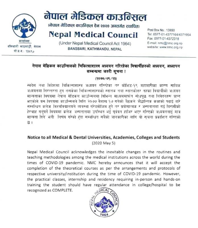 नेपाल मेडिकल काउन्सिलले यसअघि एक सूचना जारी गर्दै शैद्धान्तिक कोर्ष तथा थेसिसहरु अनलाइनबाटै पनि अध्ययन गर्नसकिने भए पनि प्राक्टिकल विषयहरु सम्बन्धीत ठाउँमै गएर अध्ययन गर्नुपर्ने बताएको थियो ।