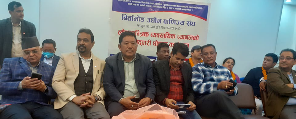 विर्तामोड ५ फागुन । विर्तामोड उद्योग वाणिज्य संघको आगामी नेतृत्वका लागि प्रकाश शिवाकोटीको नेतृत्वमा लोकतान्त्रिक व्यवसायिक प्यानलको उम्मेद्वारी घोषणा गरेको छ । विर्तामोडमा आज आयोजित पत्रकार सम्मेलनमार्फत उम्मेद्वारीको घोषणा गरेको हो ।