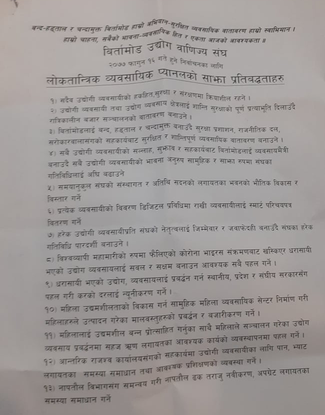 लोकतान्त्रिक व्यवसायिक प्यानलको तर्फबाट २६ बुँदे साझा प्रतिवद्धता जाहेर गर्दै उद्योगी, व्यवसायी तथा उद्योग, व्यवसाय क्षेत्रलाई शान्ति सुरक्षाको पूर्ण प्रत्याभूति दिलाउँदै रात्रीकालीन बजार सञ्चालनको वातावरण बनाउने, विर्तामोडलाई बन्द हडताल र चन्दा मुक्त बनाउँदै, शान्तिपूर्ण व्यवसायिक वातावरण बनाउने, प्रत्येक व्यवसायिको विवरण डिजिटल प्रविधिमा राखि व्यवसायिलाई स्मार्ट परिचयपत्र वितरण गर्ने सवाललाई प्राथमिकताका साथ उठाइएको छ ।