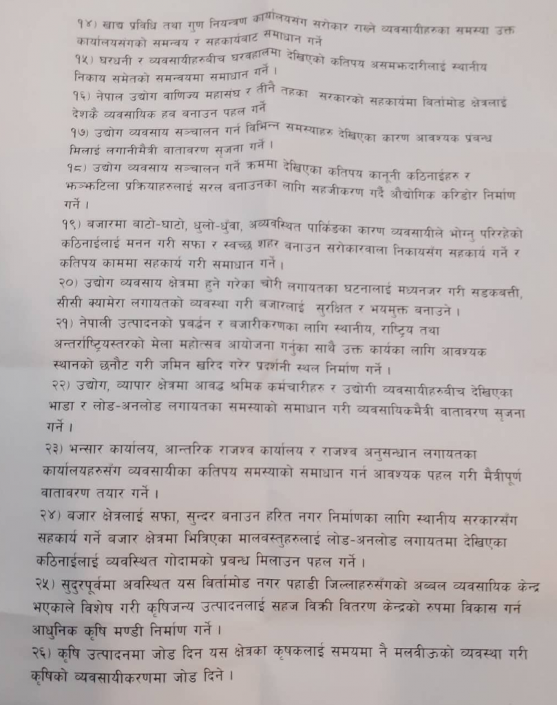 त्यसैगरी कोरोना भाइरसबाट खस्किएको उद्योग, व्यापार तथा व्यवसायलाई सवल र सक्षम बनाउन स्थानीय प्रदेश र संघीय सरकारसंग समन्वय गरी करको दरलाई न्यूनिकरण गर्ने, महिला उद्यमशीलताको विकास गर्न सामुदायिक महिला व्यवसायिक सेन्टर निर्माण गरी महिलाले उत्पादन गरेका सामग्रीको राष्ट्रिय र अन्तराष्ट्रिय स्तरमा बजारीकरण गर्ने, घर धनी र व्यवसायीहरुबीच देखिंदै आएको कतिपय असमझदारीलाई स्थानीय निकायसहितको समन्वयमा समाधान गर्ने, उद्योग व्यापार क्षेत्रमा आवद्ध श्रमिक कर्मचारी र उद्योगी, व्यवसायी र व्यापारीबीच देखिएको भाडा र लोडअनलोड लगायतका समस्यालाई बैज्ञानिक ढंगले समाधान गरी व्यवसाय मैत्री वातावरणका लागि पहल गर्ने लगायतका प्रतिवद्धता अघि सारेको छ ।
