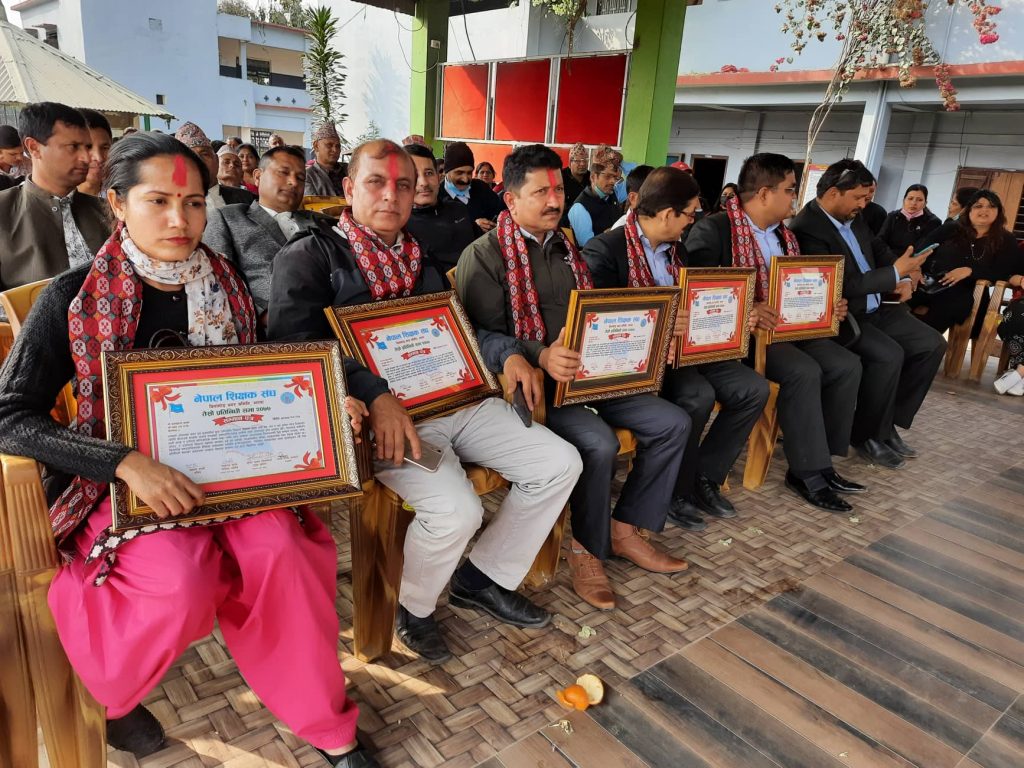 संविधानसभा सदस्य सुधिरकुमार शिवाकोटीको प्रमुख आतिथ्यता तथा नेपाल शिक्षक संघका कार्यवाहक अध्यक्ष लता खरेलको अध्यक्षतामा सम्पन्न कार्यक्रममा अवकास प्राप्त पूर्व प्रधानाध्यापकहरु मनबहादुर लिम्बू, विन्दु श्रेष्ठ, लेखनाथ भट्टराई सहित १८ जनालाई दीर्घ सेवा सम्मानद्वारा सम्मान तथा विभुषित गरिएको छ ।