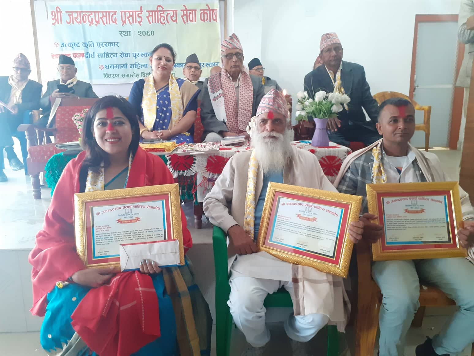 पुरस्कृत तीनैजनालाई कार्यक्रमका प्रमुख आतिथि कोमलप्रसाद पोखरेल, संस्थाका अध्यक्ष गोपीकृष्ण प्रसाई, प्राज्ञसभा सदस्य सुभद्रा भट्टराई, केशवराज खनाल लगायतले दोसल्ला, सम्मानपत्रसहित नगद राशीद्वारा पुरस्कृत तथा सम्मान गरिएको थियो ।