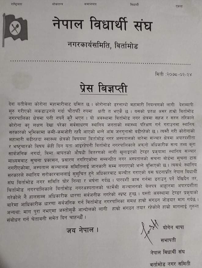 विर्तामोड २६ जेठ । वीमाको औषधी वितरणपूर्व गरिनुपर्ने टेण्डर आह्वानमा स्थानीयलाई सूचनाको हकबाट बञ्चित राखेकोप्रति नेपाल विद्यार्थी संघ विर्तामोड नगर कार्य समितिले विर्तामोड नगरपालिकाको कार्यशैलीप्रति आपत्ति प्रकट गरेको छ ।