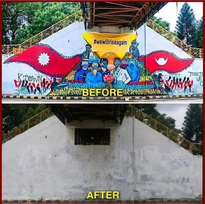 ‘कलाकारहरू सांगे थिन्ले लामा, किपा शेर्पा र सुमिना श्रेष्ठ लगायतले फ्रन्टलाईनमा जुधिरहेका स्वास्थ्यकर्मी, सफाइकर्मी, प्रहरी, पत्रकार र शव व्यवस्थापनमा खटिएका योद्धाहरूको सामूहिक चित्र दुई साताअघि काठमाडौंको एक पर्खालमा निर्माण गरेका चित्र काठमाडौं महानगरपालिकाका मेयर एवम् एमालेका नेता विद्यासुन्दर शाक्यको निर्देशनमा रत्नपार्कस्थित आकाशे पुलमा बनाइएको चित्र नगर प्रहरी प्रयोग गरेर मेटाइएको थियो ।