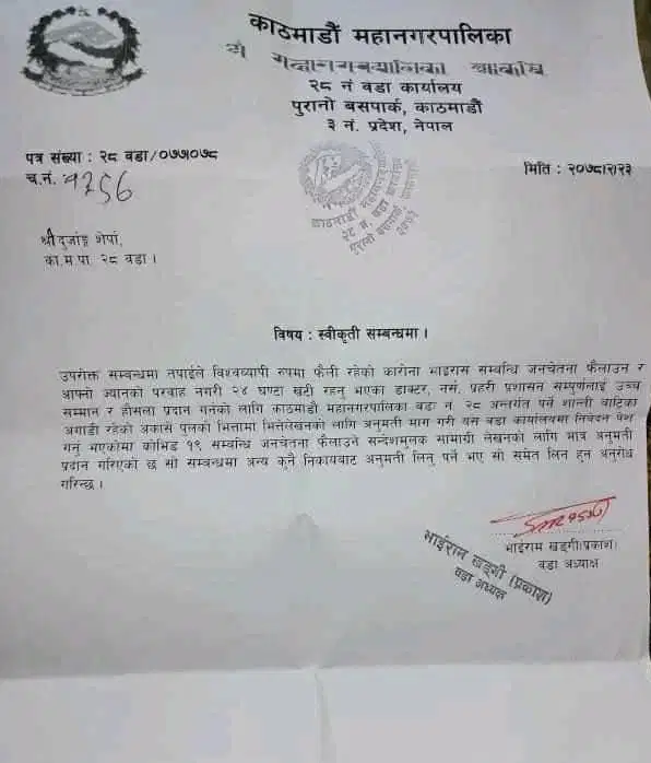 ‘अनेकौं समाचारको भिडमा महानगरलाई यो सामान्य लागेको हुनसक्छ’, उनले भने, ‘लिखित अनुमति लिएर, फ्रन्टलाईनमा जुधिरहेकाको सम्मानमा चित्र बनाउँदा बधाई होइन अपमान गरिनु सभ्य र सु–संस्कृत समाज अनुरुपको ब्यवहार किमार्थ हुन सक्दैन ।’–विज्ञप्तिमा भनिएको छ ।
